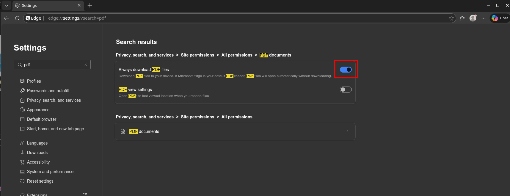 Under PDF documents, switch on: