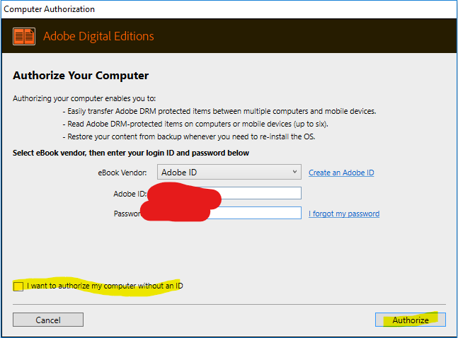 STEP 1: Set up Adobe Digital Editions and authorize without an Adobe ID when prompted.